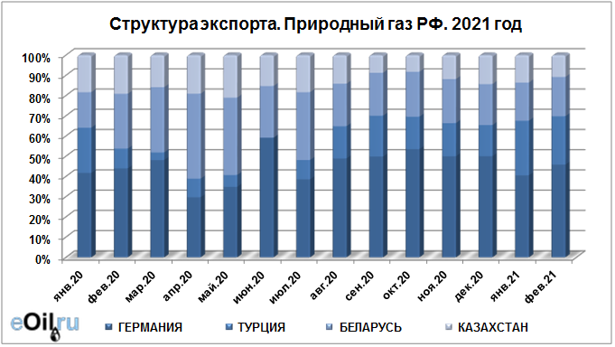 Структура экспорта природного газа из России с января 2021 по февраль 2021
