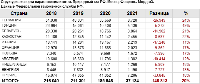 Росстат. Экспорт природного газа из России на февраль 2021