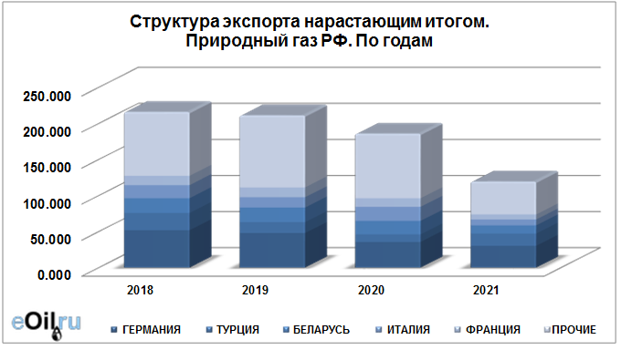 Структура экспорта природного газа из России нарастающим итогом по годам