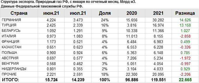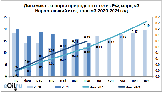 В июле 2021 года общий объем экспорта природного газа составил: 14.24 млрд. куб. м.