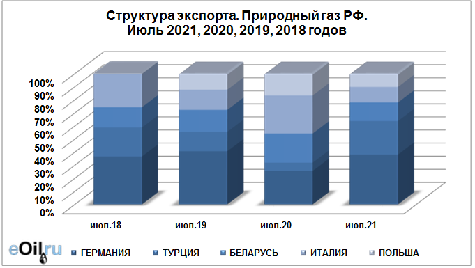 Объем поставок природного газа на экспорт за период с января 2021 года по июль 2021 года в Германию составил 30.28 млрд. куб. м, что на 14.63 млрд. куб. м больше объема поставок в данную страну в 2020 году.