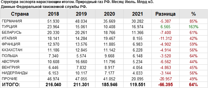 Объем поставок природного газа на экспорт за период с января 2021 года по июль 2021 года в Турцию составил 16.97 млрд. куб. м, что на 13.16 млрд. куб. м больше объема поставок в данную страну в 2020 году.