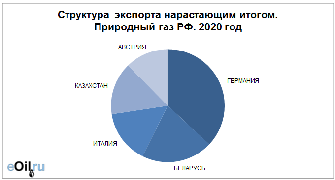 Наибольшие поставки осуществляются в Германию, объем 9.39 млрд. куб. м. За прошлый 2019 год поставки в данную страну составляли 48.03 млрд. куб. м.