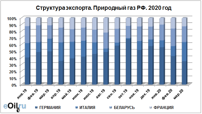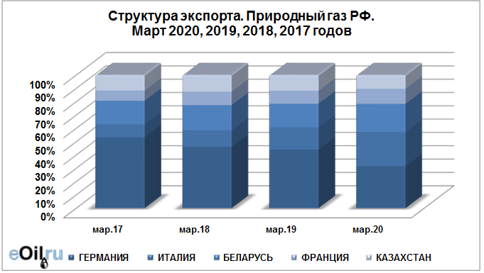 Структура экспорта природного газа из России с января 2020 по март 2020