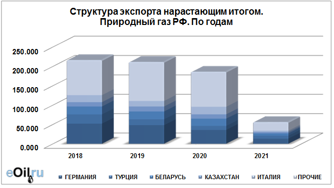 Структура экспорта природного газа из России нарастающим итогом по годам