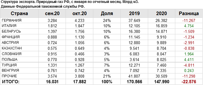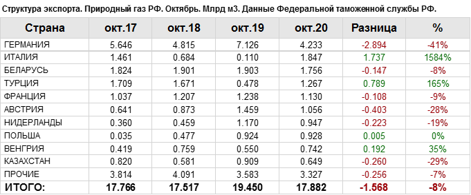 В октябре 2020 года общий объем экспорта природного газа составил: 17.88 млрд. куб. м.