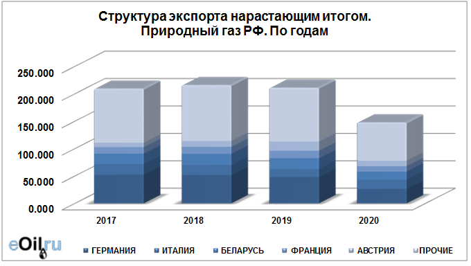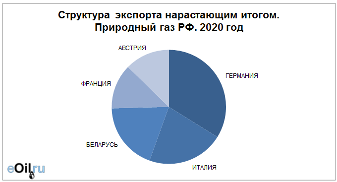 Наибольшие поставки осуществляются в Германию, объем 26.38 млрд. куб. м. За прошлый 2019 год поставки в данную страну составляли 48.03 млрд. куб. м.