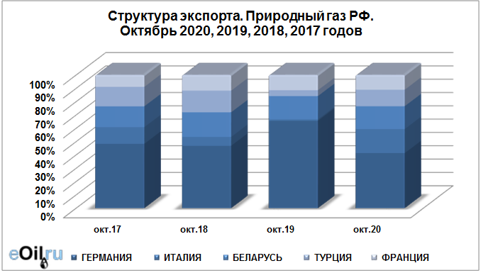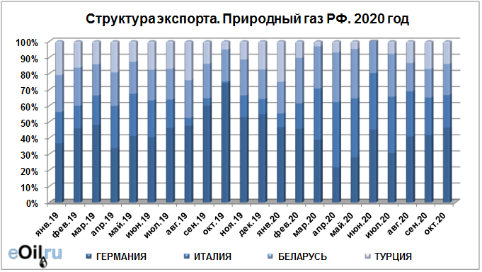 Структура экспорта природного газа из России с января 2020 по октябрь 2020