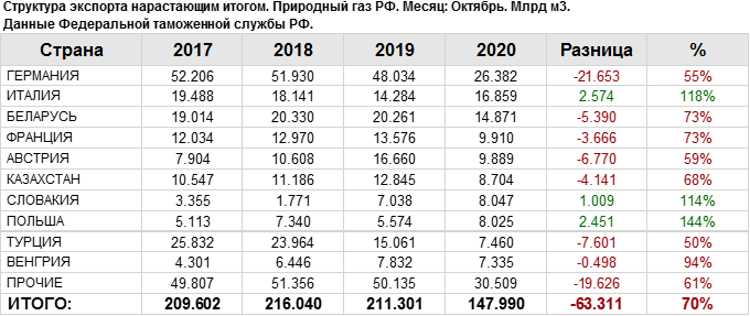 Росстат. Экспорт природного газа из России на октябрь 2020