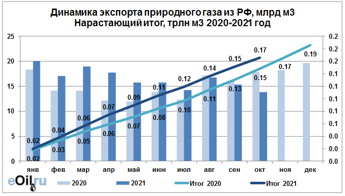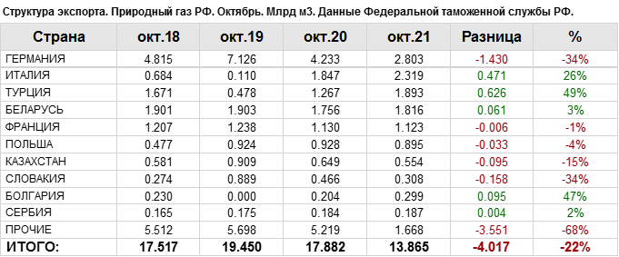 Росстат. Экспорт природного газа из России на октябрь 2021
