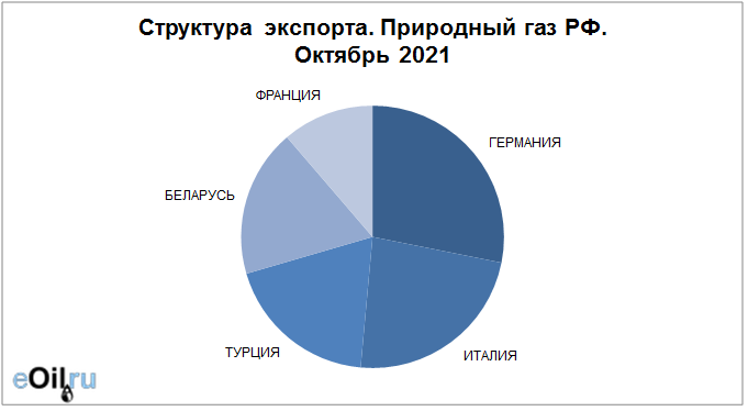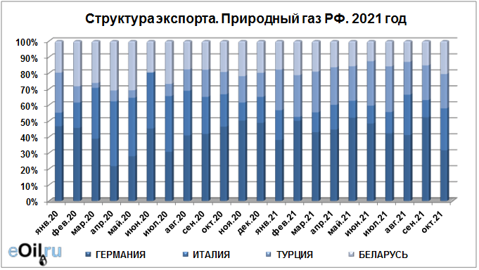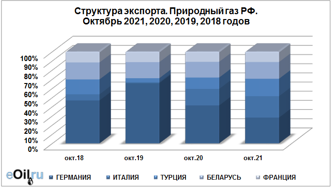 Структура экспорта природного газа из России с января 2021 по октябрь 2021