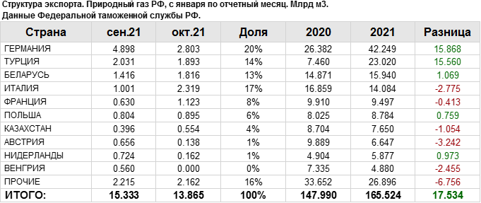 В октябре 2021 года общий объем экспорта природного газа составил: 13.86 млрд. куб. м.