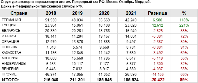 Объем поставок природного газа на экспорт за период с января 2021 года по октябрь 2021 года в Турцию составил 23.02 млрд. куб. м, что на 15.56 млрд. куб. м больше объема поставок в данную страну в 2020 году.