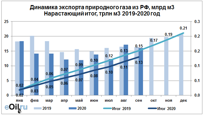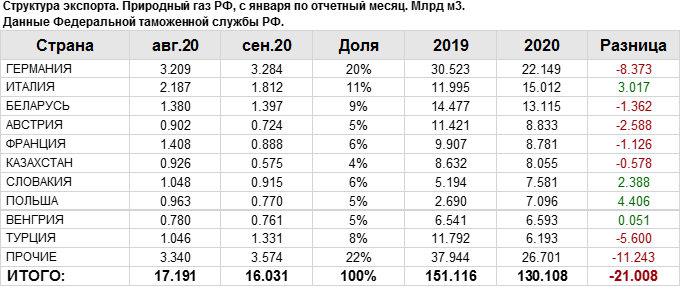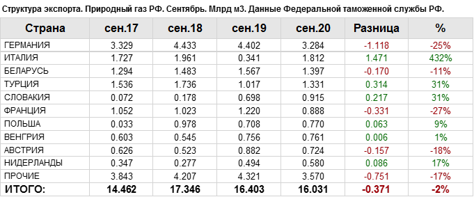В сентябре 2020 года общий объем экспорта природного газа составил: 16.03 млрд. куб. м.