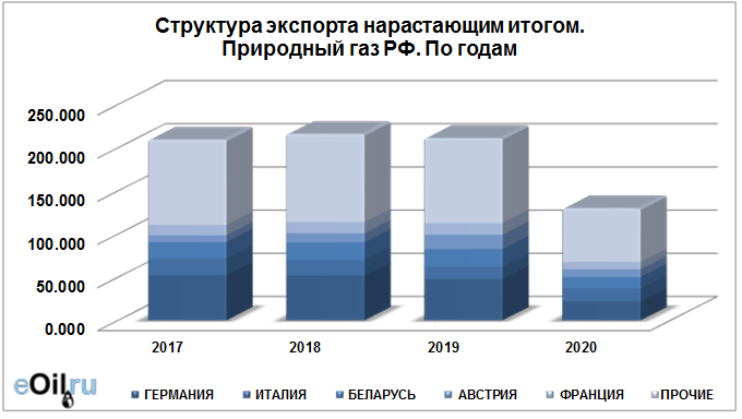 Структура экспорта природного газа из России нарастающим итогом по годам