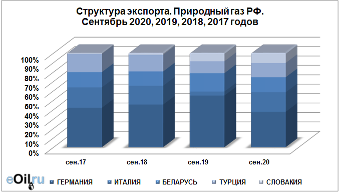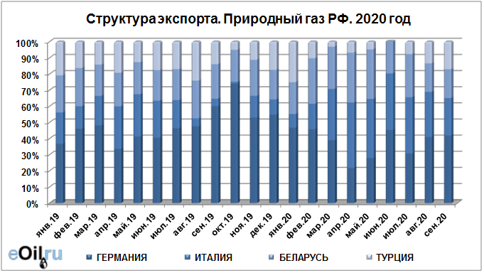Структура экспорта природного газа из России с января 2020 по сентябрь 2020
