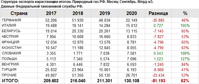 Росстат. Экспорт природного газа из России на сентябрь 2020