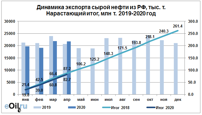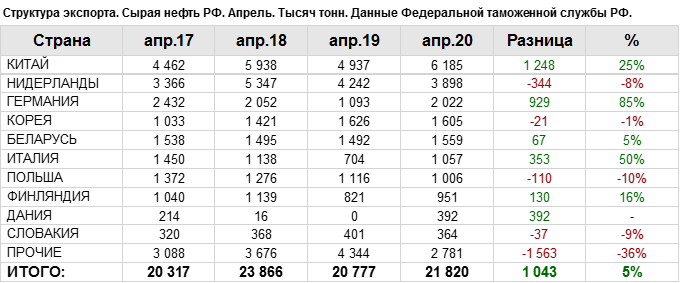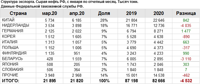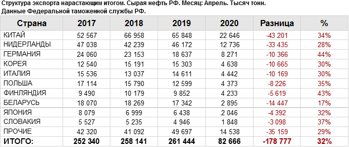 Росстат. Экспорт сырой нефти из России на апрель 2020