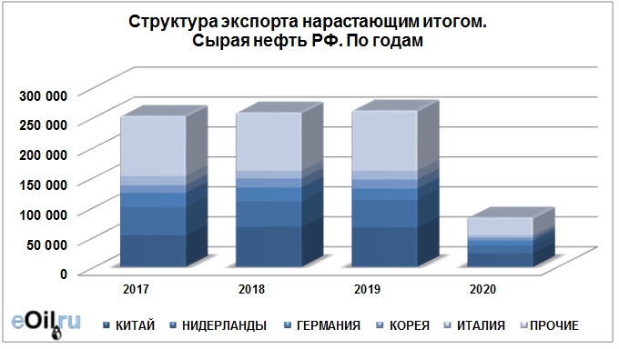 Структура экспорта сырой нефти из России нарастающим итогом по годам