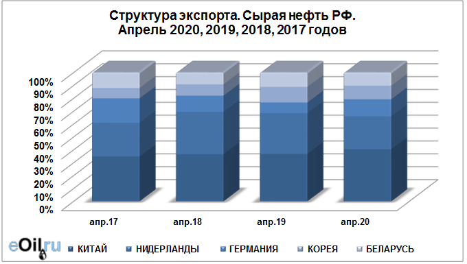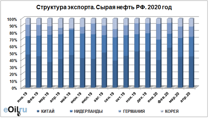 Структура экспорта сырой нефти из России с января по апрель 2020