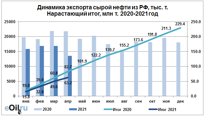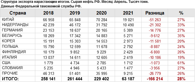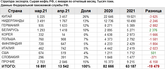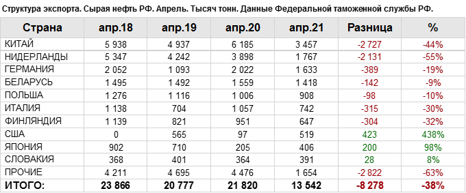 Росстат. Экспорт сырой нефти из России на апрель 2021