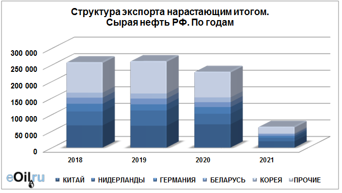 Структура экспорта сырой нефти из России нарастающим итогом по годам