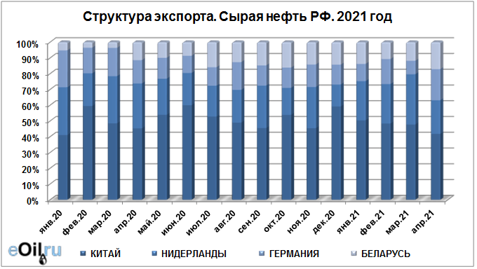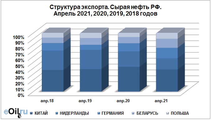 Структура экспорта сырой нефти из России с января 2021 по апрель 2021