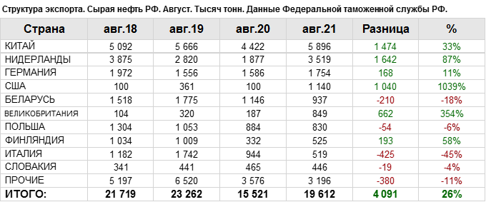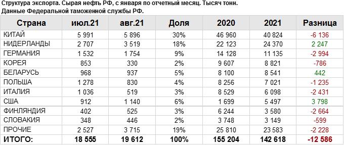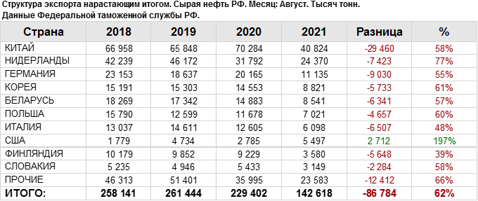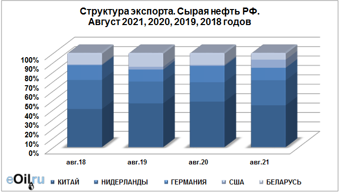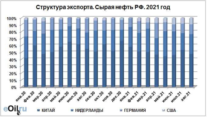 Структура экспорта сырой нефти из России с января 2021 по август 2021