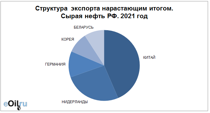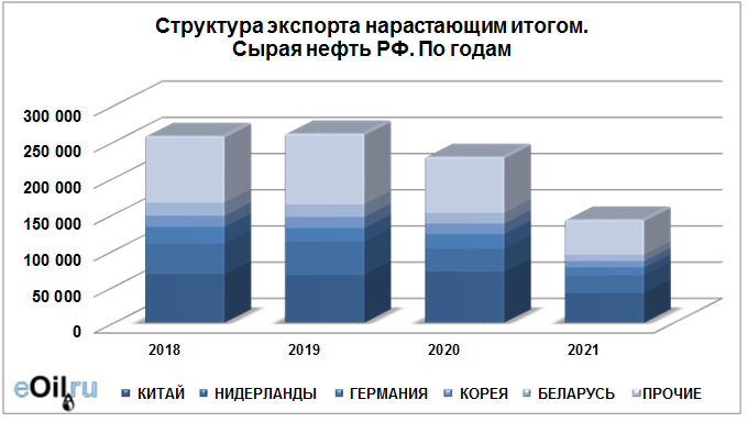 Структура экспорта сырой нефти из России нарастающим итогом по годам