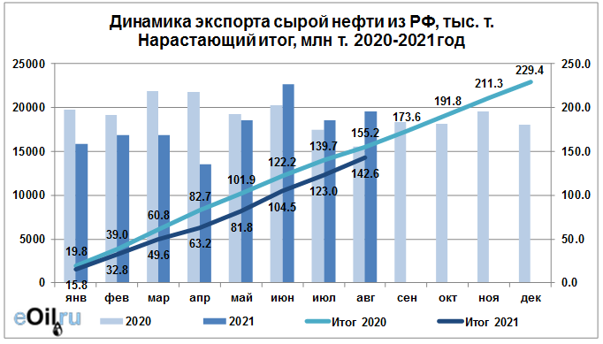 В 2021 году объем поставок сырой нефти на экспорт достиг 142618.05 тыс. тонн. Данный объем на текущий момент составляет 62% от объема прошлого 2020 года.