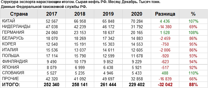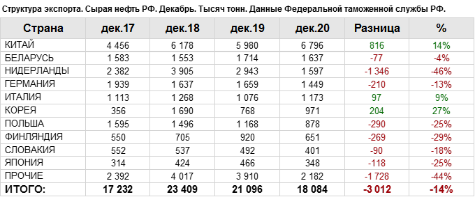 Росстат. Экспорт сырой нефти из России на декабрь 2020