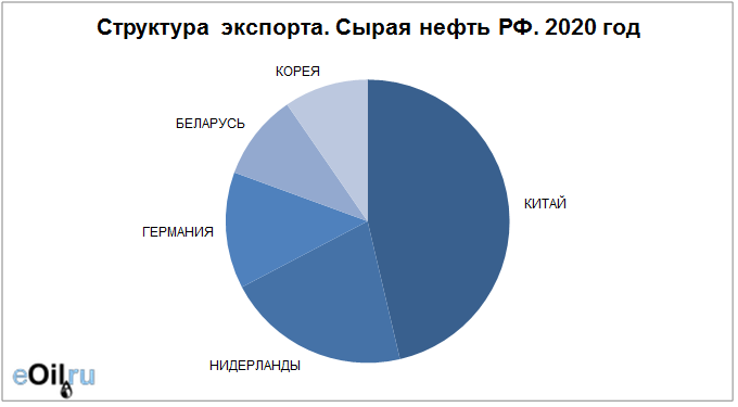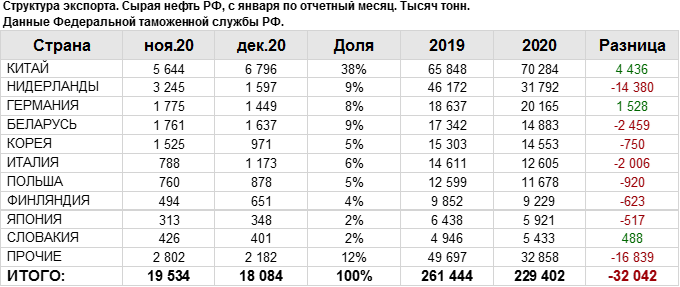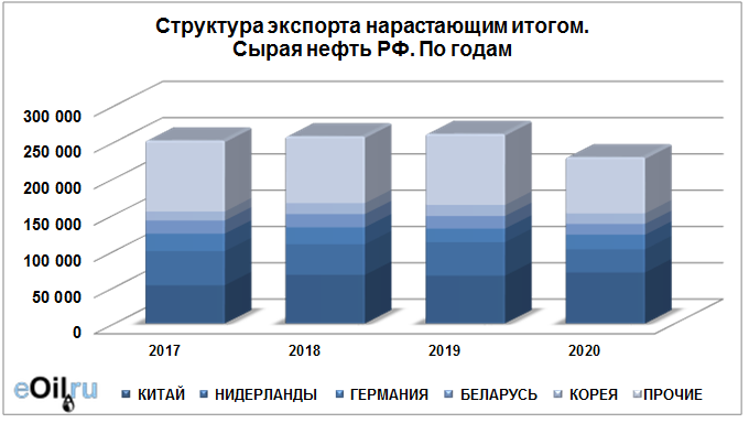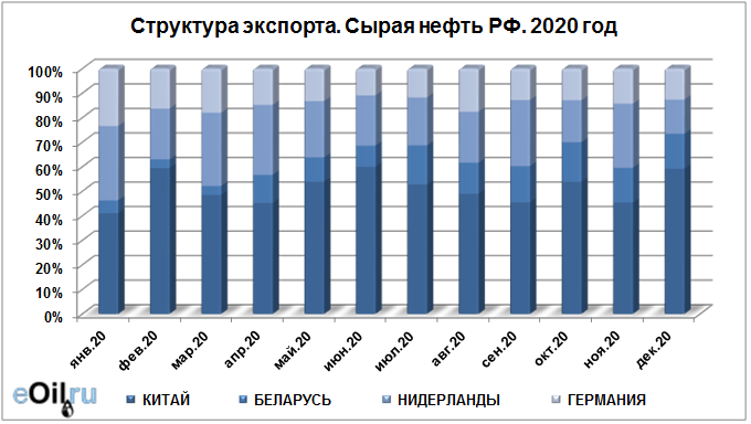 Структура экспорта сырой нефти из России с января 2020 по декабрь 2020