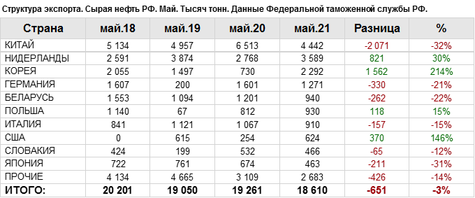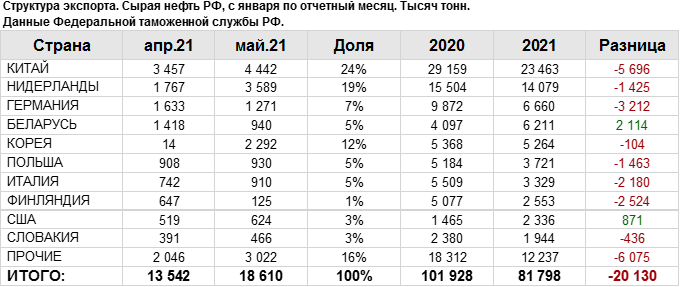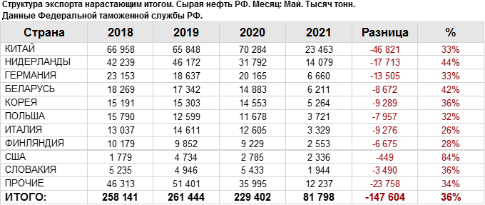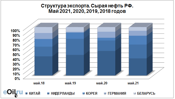 Структура экспорта сырой нефти из России с января 2021 по май 2021
