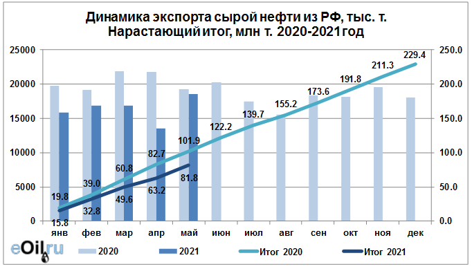 В мае 2021 года общий объем экспорта сырой нефти составил: 18610.32 тыс. тонн.