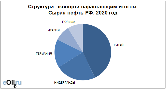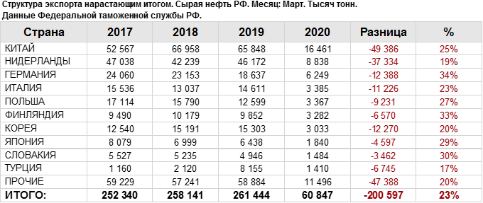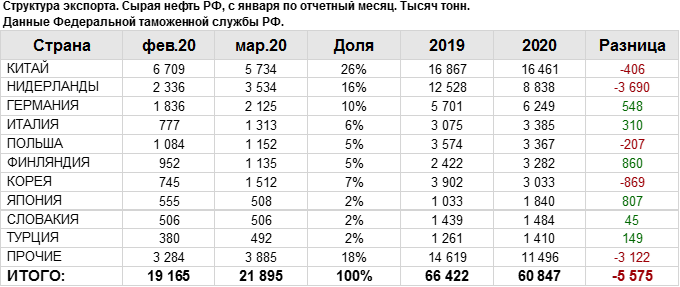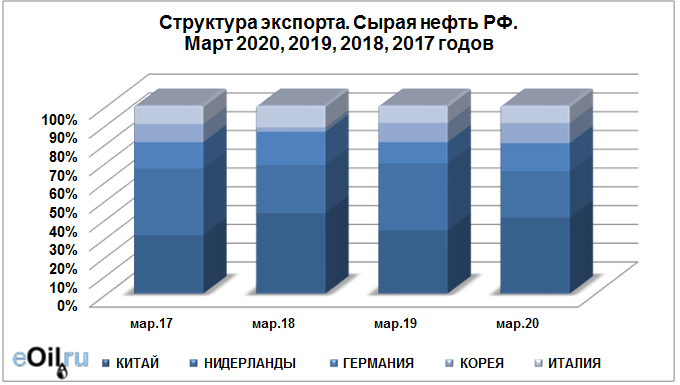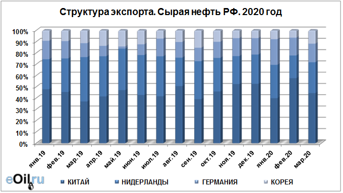 Структура экспорта сырой нефти из России с января 2020 по март 2020