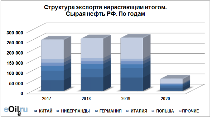 Структура экспорта сырой нефти из России нарастающим итогом по годам