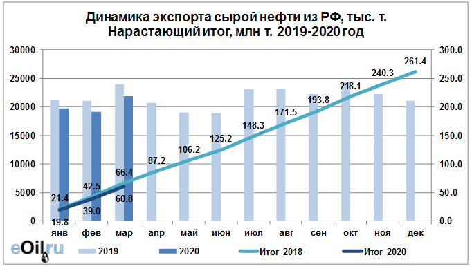 В марте 2020 года общий объем экспорта сырой нефти составил: 21894.85 тыс. тонн.