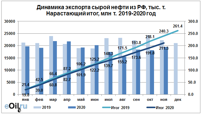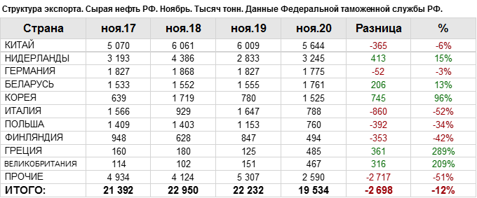 Росстат. Экспорт сырой нефти из России на ноябрь 2020