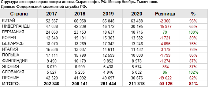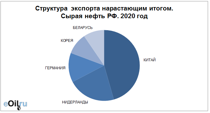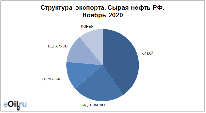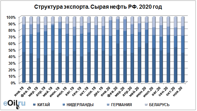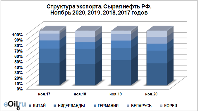 Структура экспорта сырой нефти из России с января 2020 по ноябрь 2020