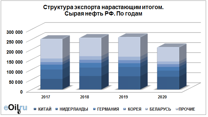 Структура экспорта сырой нефти из России нарастающим итогом по годам