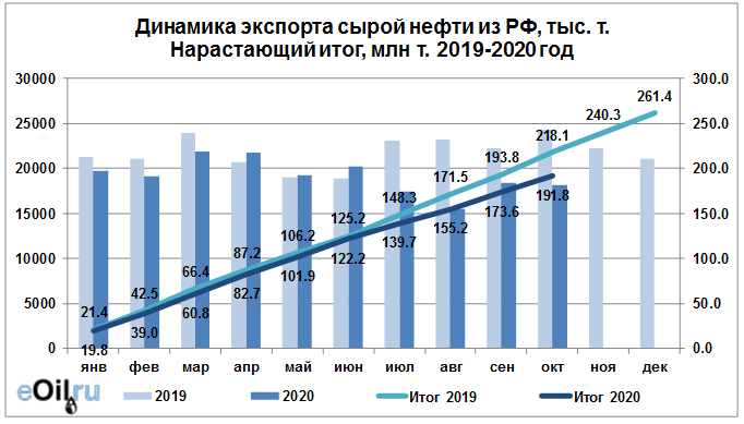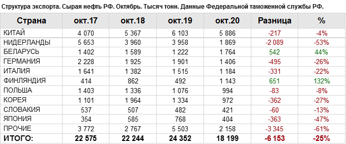 Росстат. Экспорт сырой нефти из России на октябрь 2020