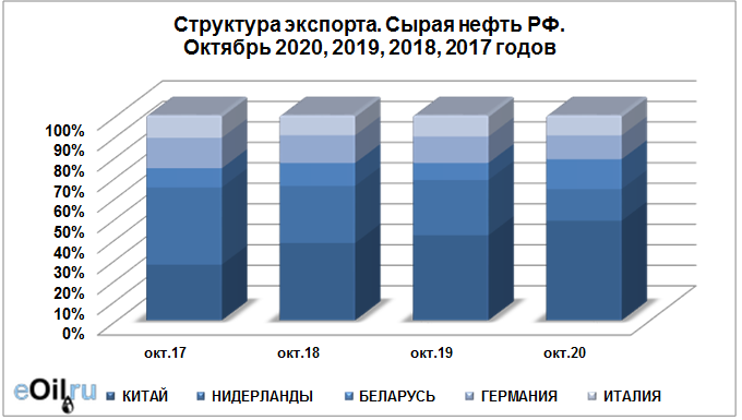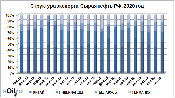 Структура экспорта сырой нефти из России с января 2020 по октябрь 2020