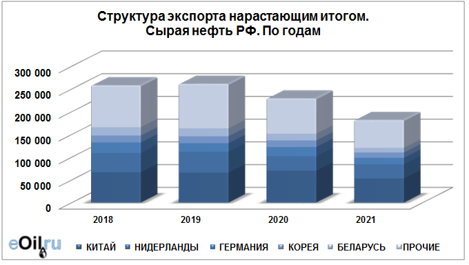 Структура экспорта сырой нефти из России нарастающим итогом по годам