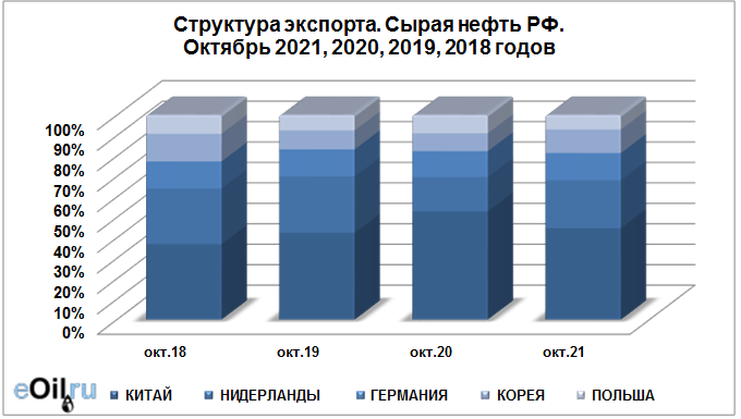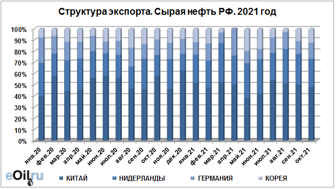 Структура экспорта сырой нефти из России с января 2021 по октябрь 2021