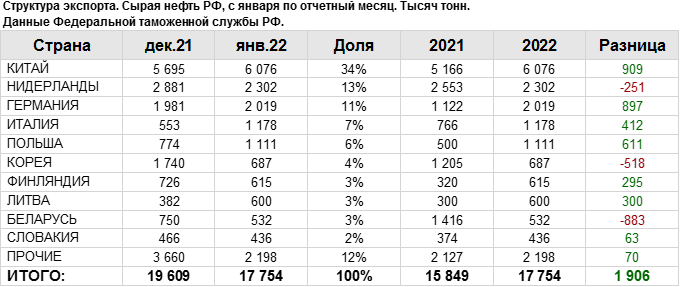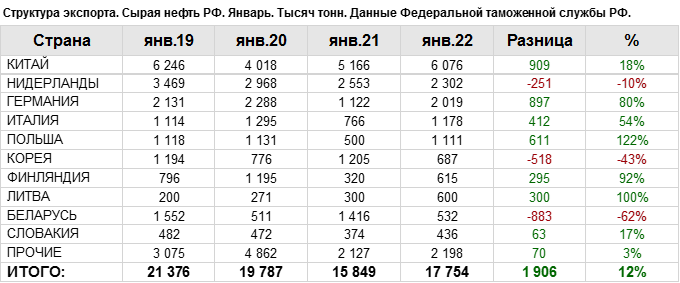 Росстат. Экспорт сырой нефти из России на январь 2022