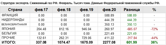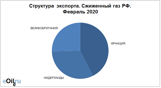 Структура экспорта сжиженного газа из России с января 2020 по февраль 2020