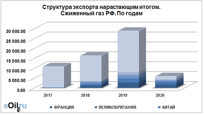 Структура экспорта сжиженного газа из России нарастающим итогом по годам