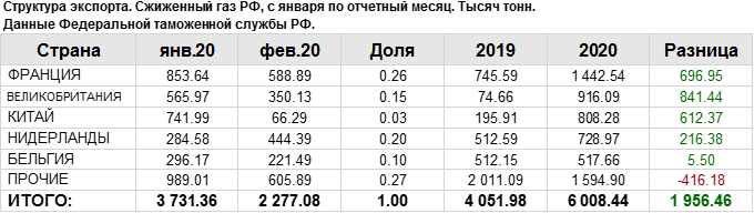 Объем поставок сжиженного газа на экспорт за период с января 2020 года по февраль 2020 года во Францию составил 1442.54 тыс. тонн, что на 696.95 тыс. тонн больше объема поставок в данную страну в 2019 году.