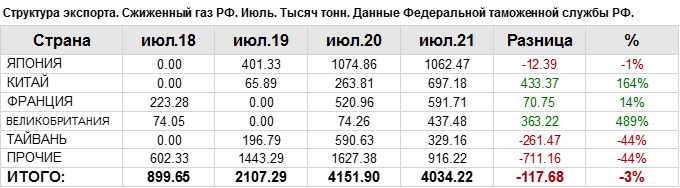 В июле 2021 года общий объем экспорта сжиженного газа составил: 4034.22 тыс. тонн.