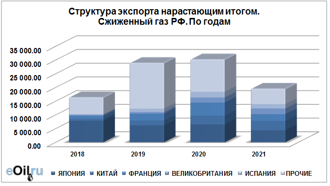 Структура экспорта сжиженного газа из России нарастающим итогом по годам